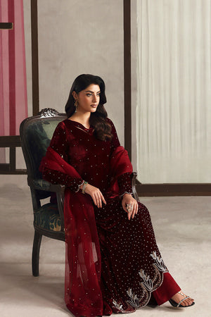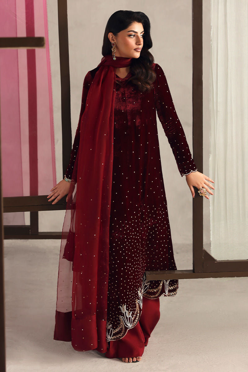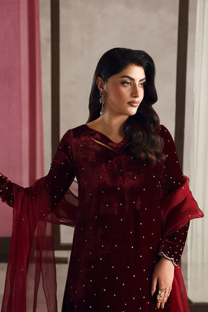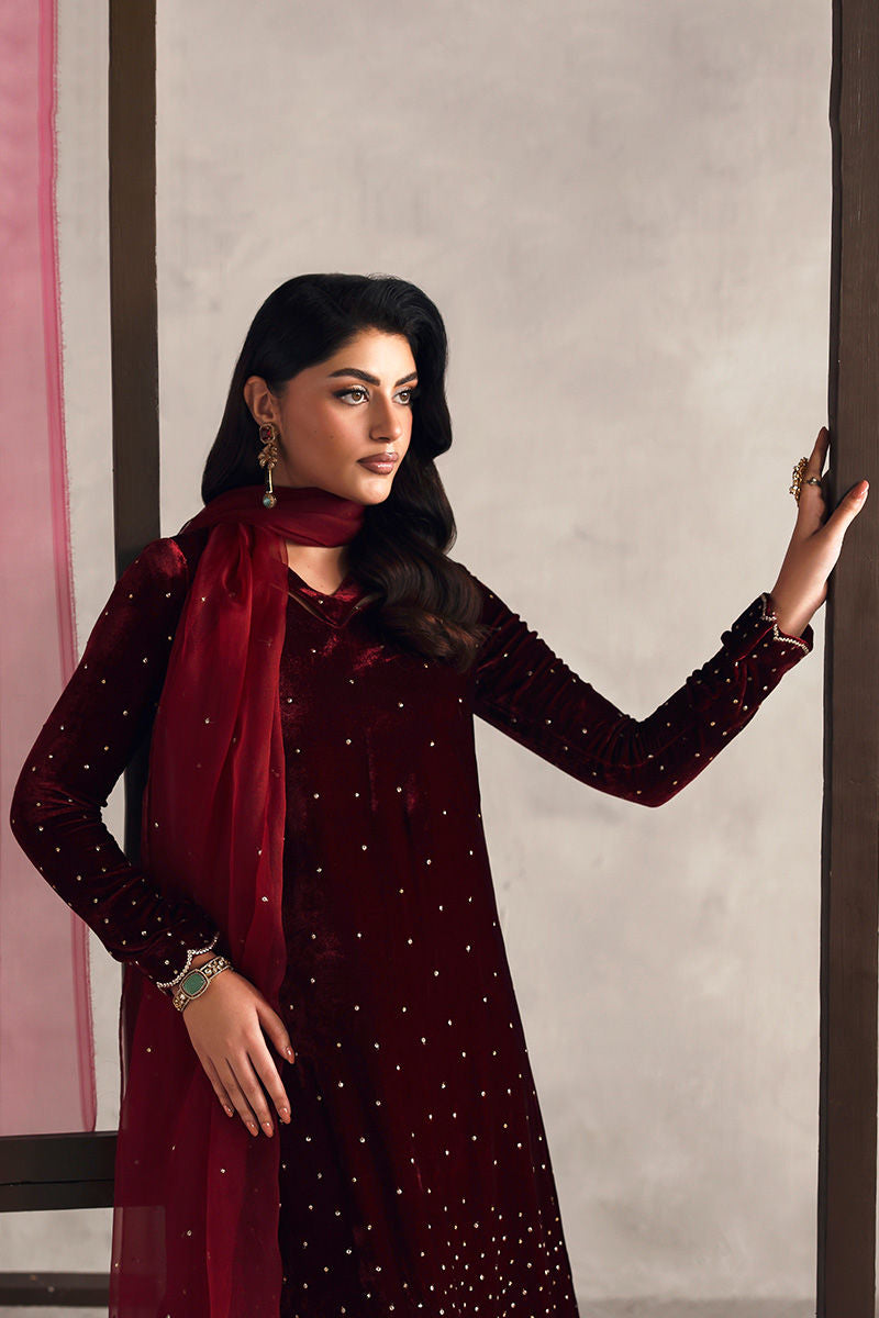 A rich maroon ensemble featuring a pure velvet shirt that exudes timeless luxury. Paired with Korean raw silk pants for a refined finish, and complemented by a pure organza dupatta that adds a graceful, airy touch to the look.