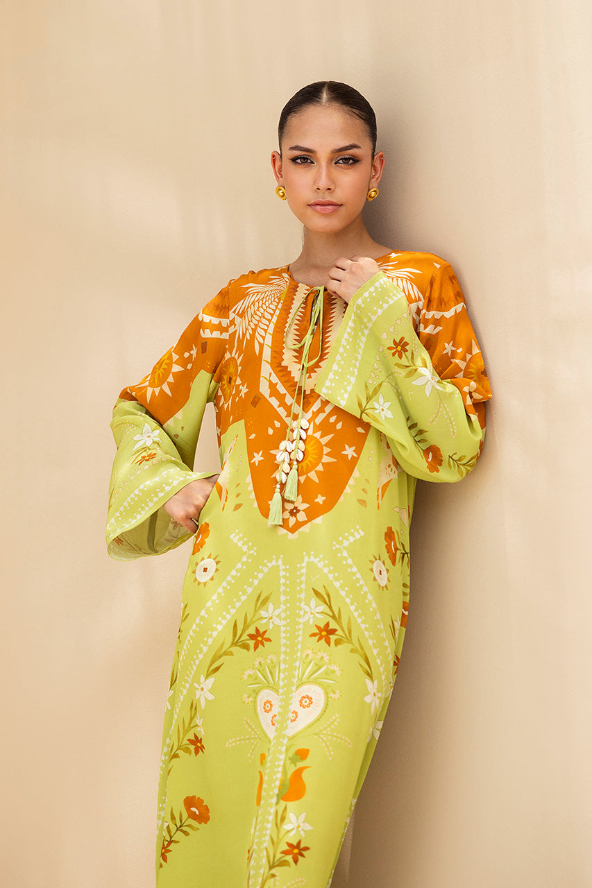 A flowing crepe kaftan, color blocked in rich terracota and pistachio, offers the perfect canvas for intricate folkloric inspired motifs. The print blends geometric and floral patterns in shades of ivory, burnt orange, ochre, and olive, arranged symmetrically to create a flattering elongating effect. A tasseled slit at the neckline is framed by a geometric border and a delicately mirrored palm motif, striking a balance between artistry and effortless sophistication.