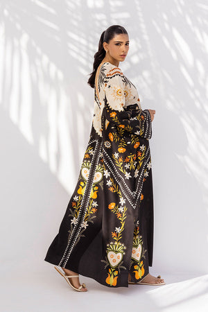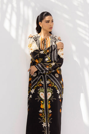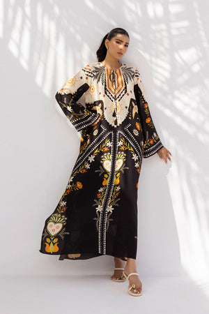 A flowing crepe kaftan, color blocked in rich ebony and ivory, offers the perfect canvas for intricate folkloric inspired motifs. The print blends geometric and floral patterns in shades of ivory, burnt orange, ochre, and olive, arranged symmetrically to create a flattering elongating effect. A tasseled slit at the neckline is framed by a geometric border and a delicately mirrored palm motif, striking a balance between artistry and effortless sophistication.