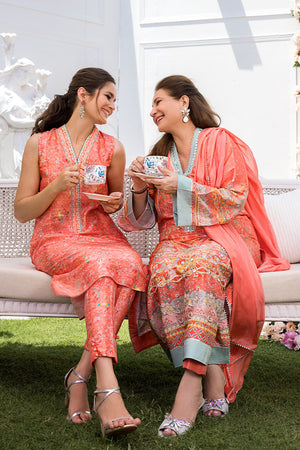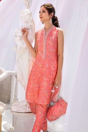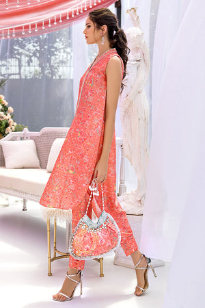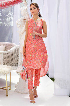 This floral digital patterned watermelon sleeveless high low straight silk shirt is a perfect fit for any daytime occasion. The outfit is finished off with a pair of silk trousers giving the co-ord set that beautiful appearance.