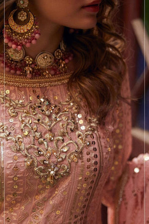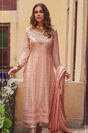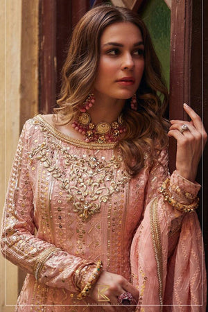 An ethereally beautiful tulle long chicken kaari in a soft blush hue is adorned with delicate embroidery and sequins to enhance the thread work. A classic outfit that will create a visually enchanting evening look!Ensemble: 3 Piece