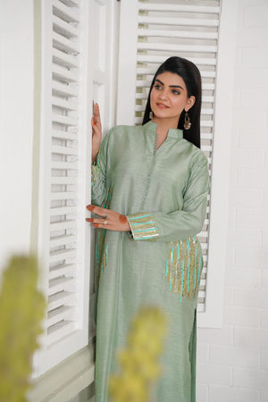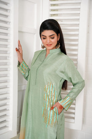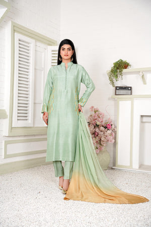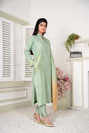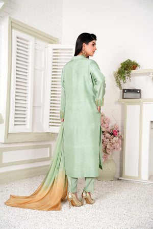 Made in a delightful shade of green, this three piece shows off a classy aura. He silk shirt with captivating and detailed embelishments as well as emaculate sequins work on pockets and sleeves. Paired with ombre dupatta and trousers.