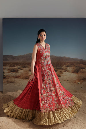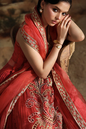 An exquisite rust gown crafted with a katan organza jacket, medium silk underdress, and pure organza dupatta. A versatile ensemble that combines refined textures with graceful charm.