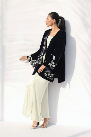 Bathed in midnight blue, this velvet jacket exudes refined grandeur through its fluid silhouette and exquisite threadwork with embellishment. Intricate botanical embroidery and flared sleeves bring a touch of quiet drama. Paired with an ivory tube top and scallop-detailed wide leg overlap pants in charmeuse, the look embodies modern sophistication.