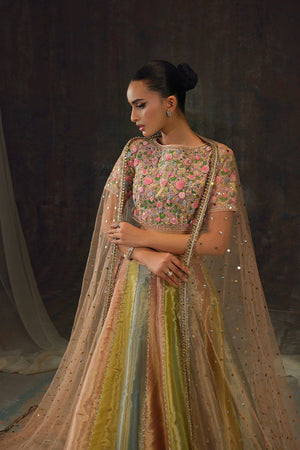Shimmering with artisanal brilliance, this Setareh lehenga is crafted from gleaming tissue panels adorned with glistening chiri panja hand embroidery that catches the light with every movement. The extra-long mukesh net dupatta drapes in a cascade of subtle sparkle, perfect for dramatic wedding entrances. The choli is a vision of intricacy—filled with delicate French knot roses, sequins, and mukesh work—while playful tassels sway from both blouse and lehenga. The back reveals exquisite cutwork, a detail that adds allure from every angle. Regal yet romantic.