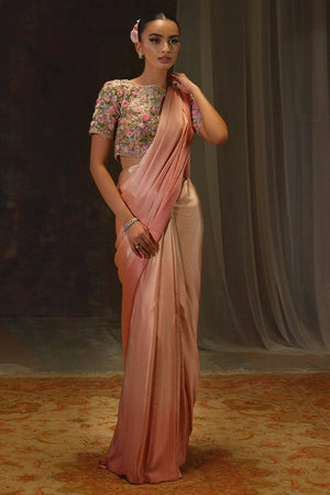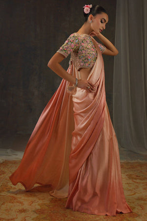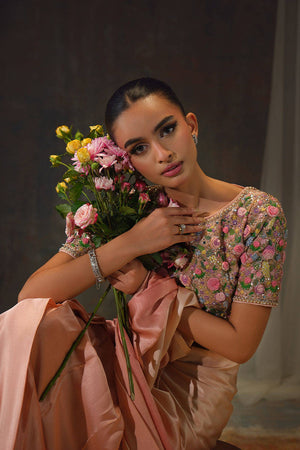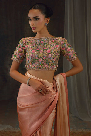 A fluid blend of romance and artistry, this Setareh saree is spun from luminous pure silk in an ombré wash of blush and peach that flows like a painted dawn. The blouse is a treasure of craftsmanship—hand-embroidered with French knot roses in bloom, The back is an alluring lattice of cutwork, finished with beaded tassels that sway with every movement.
