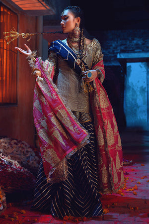 A Navy Blue raw silk base is hand appliqued chevron with Indian gota cut in various widths and sizes. The kameez features a hand embellished neckline sold with a matching organza gota dupatta.The shipping charges for all articles barring Bridals are as follows: