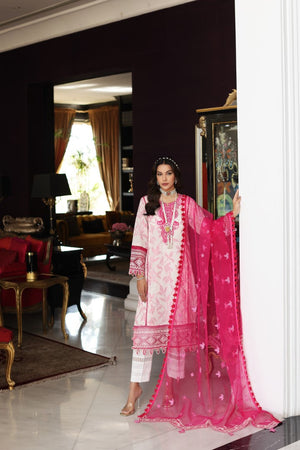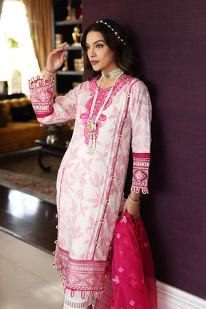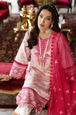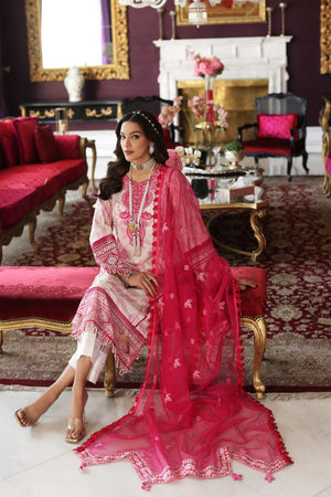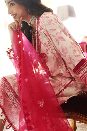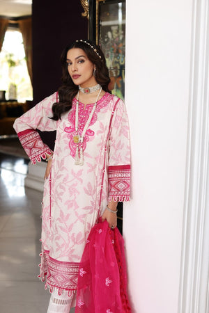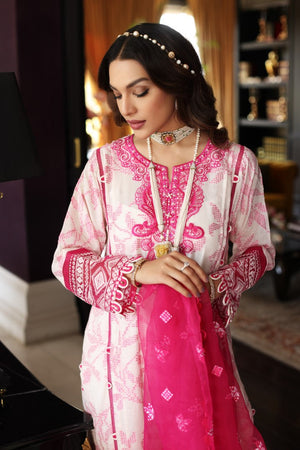 A vibrant pink pattern on jacquard lawn with traditional and modren embroidery in cross stitch ehanced with laces, paired with embroidrered organza dupatta & lawn pants.