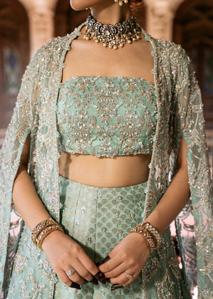 This captivating fresh ice blue ensemble features a shirt, embellished bustier, and lehenga. The shirt, crafted from aqua Kathan organza, is exquisitely hand-embellished with a dazzling mix of silver, lilac, and gold tones and boasts elegant, long drapey sleeves. It is paired with a stunning flared Jamavar lehenga, adorned with a graceful booti spray and heavy embellishments along the border, creating a look of opulent sophistication. This ensemble combines intricate detailing with rich textures, making it a perfect choice for any special occasion where you want to shine with elegance and style.