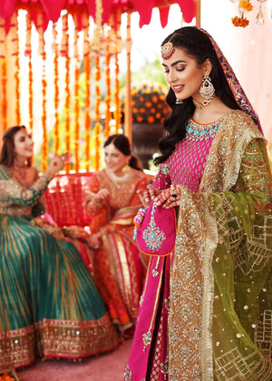 Look exquisterly rediat in this fabalous couture piece with hand crafted artistry of multiple stones and crystals. This festive pishwas with chunnri dupatta and kamkhab lehngha is a breath taking for your mehndi look.The shipping charges for all articles barring Bridals are as follows: