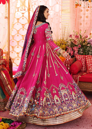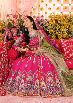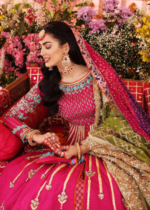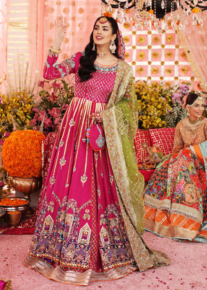 Look exquisitely radiant in this fabulous couture piece with hand crafted artistry of multiple stones & crystals. This festive peshwas with chunnri dupatta & kamkhab lehngha is a breath taking for your mehndi look.