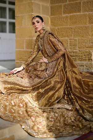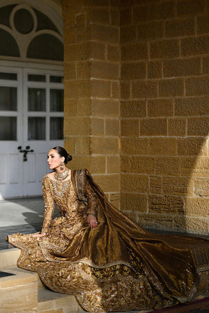 This stunning bridal features a rich gold-toned base adorned with an all-over jaal of hand-embroidered zardozi, gota, dabka, and resham work. The back boasts a keyhole detail tied with delicate tassels, while the long trailing silhouette adds grandeur and grace. Intricately embellished floral motifs flow seamlessly from bodice to hem, with accents of deep maroon and metallic threadwork adding dimension. The matching dupatta is bordered with fine handwork with resham embroidery.