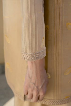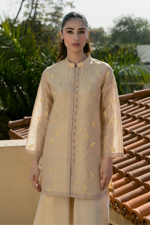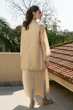 Make a stylish statement at your next festive occasion with our stunning Shahin jacket. Crafted from pure organza raw silk in a soft beige hue, this beautifully embroidered piece features intricate lace detailing and is perfectly paired with our triangular pants. Get ready to turn heads with this effortlessly refined ensemble!