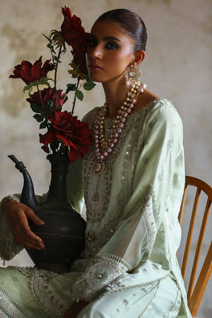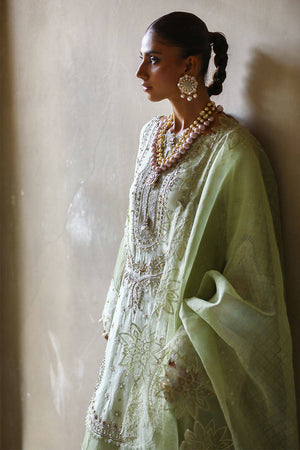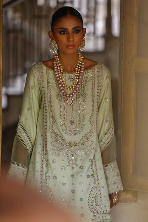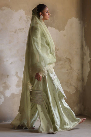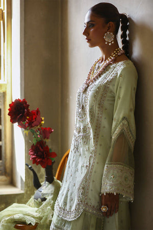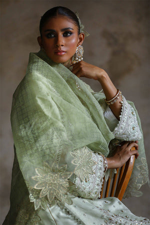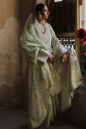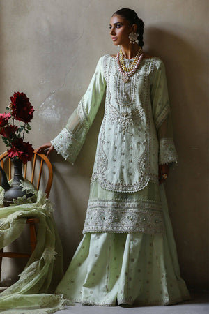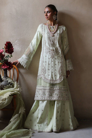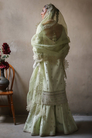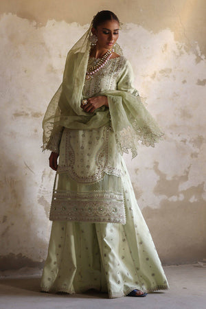 Shahlale is our glacial green-hued signature MNR kameez sharara ensemble. The shirt is made up of cotton net fabric that is richly embroidered in architectural and floral motifs embellished with beadwork and sequins and features sheer cotton net panels. It is paired with a voluminous cotton net sharara with delicate flowers made of glimmery beads and sequins. The dupatta to go with it is equally charming made of airy organza that is block printed in the most beautiful patterns and has edgy cutouts.The shipping charges for all articles barring Bridals are as follows: