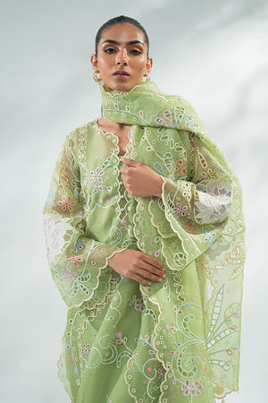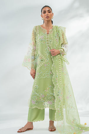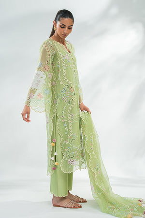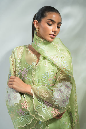 'A timeless organza shirt and dupatta are rendered with a playful fusion of cutwork and signature SM floral embroidery in pastel shades over a lemon green base. Rawsilk trousers with scalloped edges and tassel detailing complement the look.