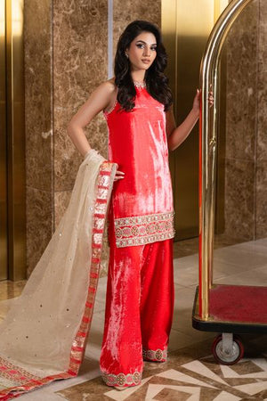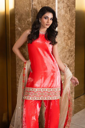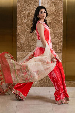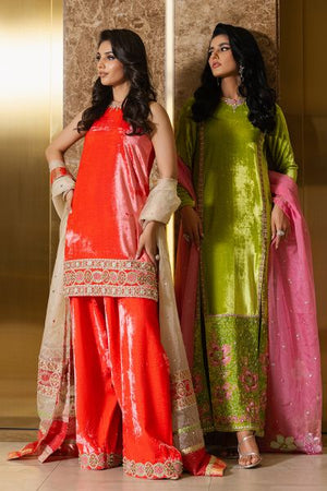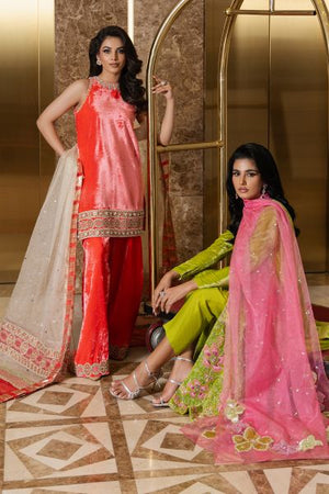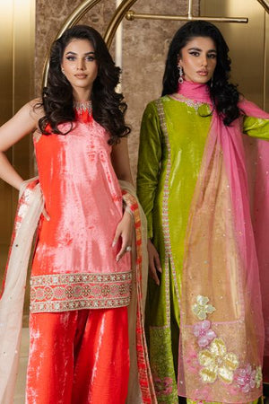 This enchanting outfit features a vibrant watermelon pink tone, exuding freshness and elegance. The silhouette includes a chic short shirt paired with a shalwar. The outfit is complemented by a delicate organza dupatta Intricate embroidery adorns the shirt and shalwar, showcasing beautiful motifs that enhance the overall aesthetic. The embroidery features a harmonious blend of floral and patterns, embellished with beautiful materials The back of the shirt is equally stunning, featuring a detailed motif that adds an element of surprise and sophistication.