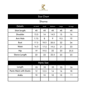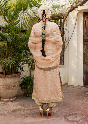 The shirt is made of zari jamawar and features a handcrafted neckline, sequins and pearls strewn throughout, and decorated sleeves with constructed borders. It is complimented with a mukesh dupatta made of pure khaddi cotton net, which has a four-sided border. Zari jamawar trousers with embellishments on the border complete the outfit.