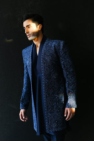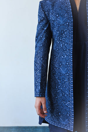 An edgy take on a classic sherwani, this midnight blue front open jacket is cut from pure rawsilk with tonal embroidery in a floral pattern. A matching pure rawsilk shirt with a statement pleated neckline, peeks through the jacket. Paired with midnight blue tapered rawsilk trousers.