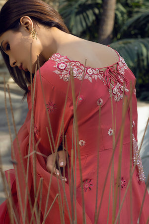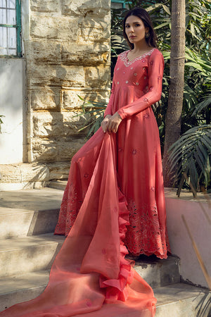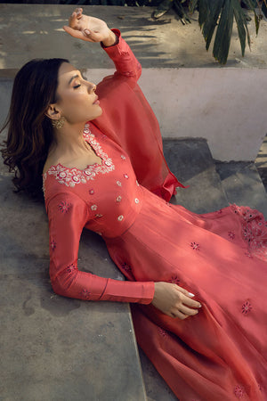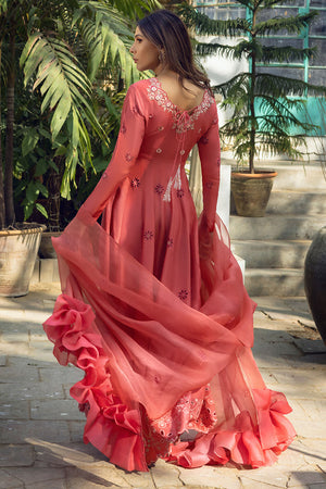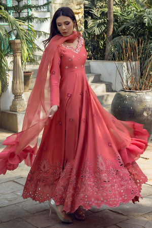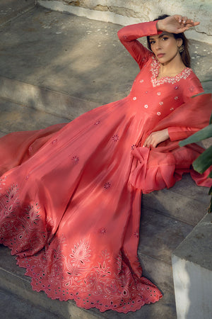 Dive into the charm of our pure rawsilk kalidar. The oversized schiffli and intricate embroidery on the bodice steal the spotlight, adorned with meticulous handwork detailing. Complete with an organza dupatta featuring fabric manipulation, this ensemble is a symphony of color and craftsmanship.