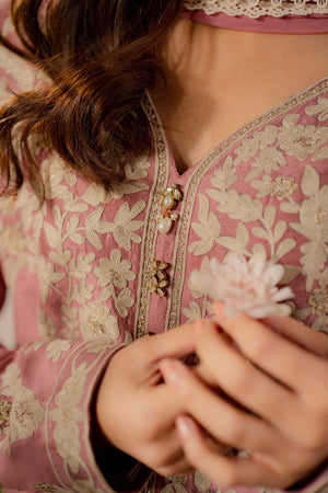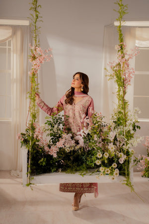 Shehwar, a fine example of artistry on fabric is a shirt featuring a floral symphony all along the garment with meticulous stitching details. Exceptionally hand worked with tilla and brilliant embroidery details adding the perfect amount of oomph to a beautiful chai pink base. A chic outfit perfectly for all your celebrations.