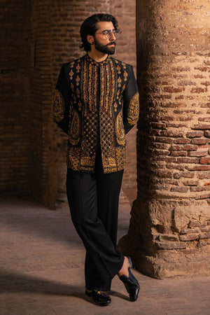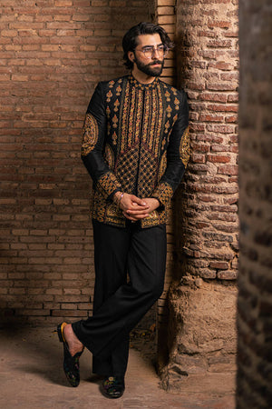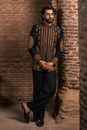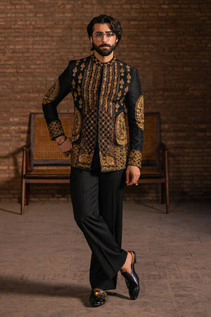 Ensemble Sheikhzada from the 'Raag Darbari' collection, an ode to Mughal opulence, is presented in an alluring shade of midnight obsidian. This pure raw silk jacket is richly embellished with resham thread embroidery in architectural Mughal jaali patterns, accented with tilla metallic details. The intricate adda work, inspired by the frescoes of Asaf Jah Haveli, infuses shades of copper, gold, and red, making it a perfect choice. The pure paper silk shirt, featuring a refined band collar, is paired with sleek black suiting pants for a princely silhouette. Perfect for layering beneath a richly decorated jacket or worn on its own.
