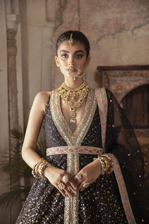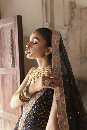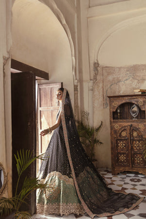 Encrusted with sheesha, gota, naqshi, and meticulous gold embroidery featuring a sooty black canvas with a hint of mint green makes the ensemble reminiscent of a starry sky on a dark moonless night. The Shirin gown is a stunning display of our mastery over the seamless use of colors.