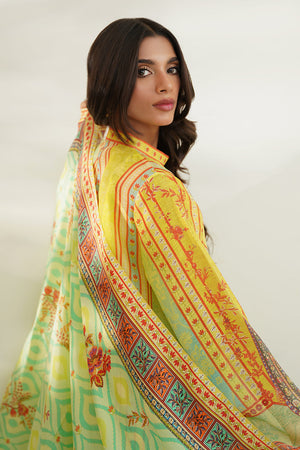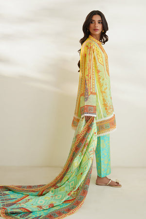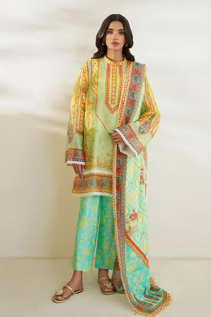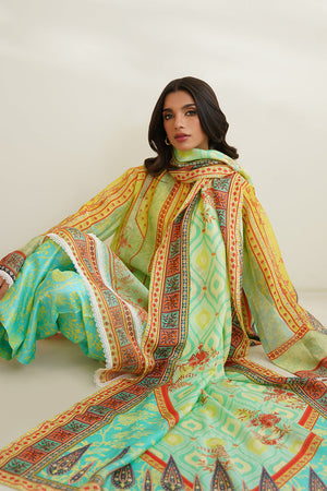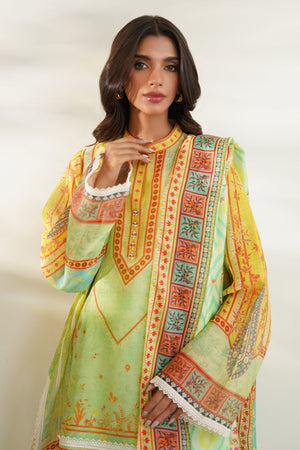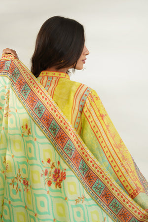 'A relaxed fit short kurta cut from pastel green cotton net is rendered with floral print and elegant lacework. The neckline is adorned with worked buttons, paired with a printed rawsilk shalwar and a painterly printed medium silk dupatta.