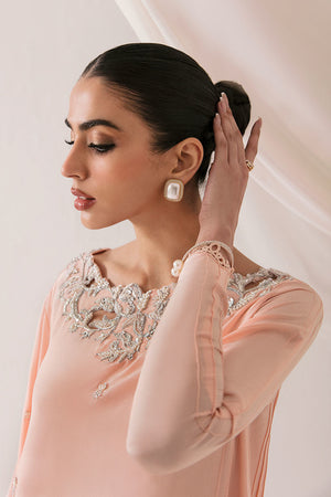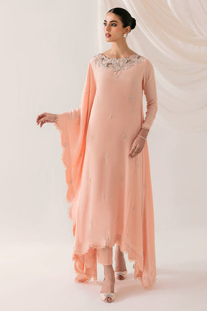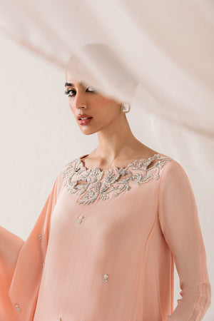 This peach free fall korean grip kaftaan with one sided fitted sleeves and all over lace detailing. Beautiful hand crafted cutwork neckline with details of zari, tilla, resham and sequins.
