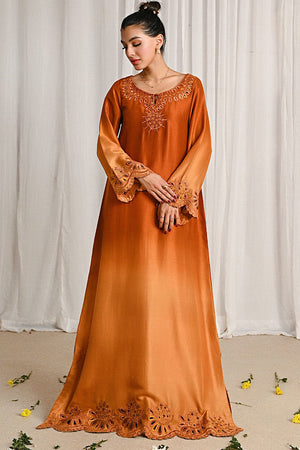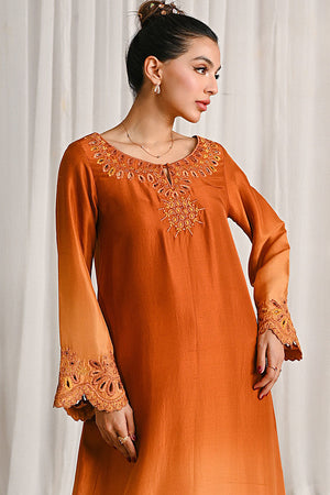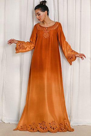 The Sienne outfit showcases a stunning rust ombré raw silk kaftan shirt, featuring intricate cutwork and a beautifully embroidered monochrome neckline and hem.
