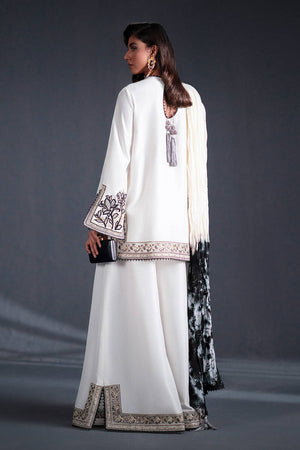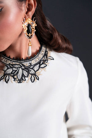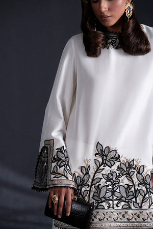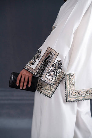 A striking interplay of white takes form in a short, tailored kameez adorned with golden lilies embroidered in black and gold hues along the hem and sleeves. Delicate slits accentuate the sides of the shirt, while the sleeves feature a slit detail bordered by intricate trims, creating a sophisticated interplay of structure and embellishment. The wide-leg trousers, similarly detailed with slits and bordered trims, anchor the ensemble. Adding an unexpected flourish, a tie-dye dupatta swirls with color, a vivid counterpoint to the monochromatic base.