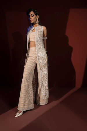'Discover the epitome of sophistication with 'Silken Trails: Nude Floral Jacket,' a testament to modern elegance and timeless allure. The nude-toned, front open sleek jacket, meticulously adorned with intricate ivory Sequence embroidery detailing in floral and tribal patterns, embodies an understated grace that captivates with every stitch. Its majestic back trail adds a touch of regal charm, while the bustier complements the ensemble, creating an ensemble that exudes contemporary finesse. Paired harmoniously, the bell-bottom pants feature delicate Sequence embroidery borders, seamlessly integrated with silver jewellery material, elevating the outfit to a realm of unparalleled elegance. The subtle shimmer of the silver jewellery work enhances the jacket and pants, adding a touch of opulence. 'Silken Trails' stands as a masterpiece where modern design meets traditional artistry, weaving a tale of sophistication and grace with every movement.'The shipping charges for all articles barring Bridals are as follows: