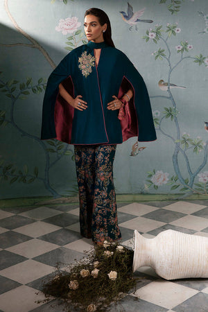 A stunning pure raw silk teal blue cape with embellished motif on neck and extravagant sleeves, paired with screen printed flared pants.Cape Length: Front 32