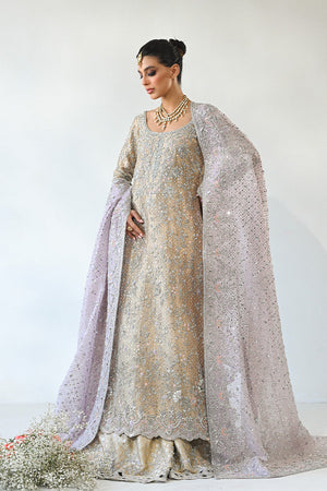 An enchanting champagne-toned a-line shirt is cut from tissue, forming a perfect base for contrasting silver hued zardoze and sequin embroidery accented with resham flowers in subtle shades of peach and lilac. Cutwork details decorating the slim fit sleeves add a fashion forward flavour to a classic silhouette. Crafted from matching brocade, the lehnga has a zardoze embellished border with cutwork details and scalloped edges. A lilac organza dupatta emanates a magical aura with glistening sequin details and zardoze borders sprinkled with resham flowers, continued from the timeless top.