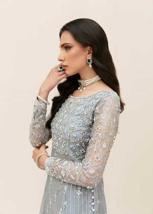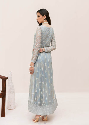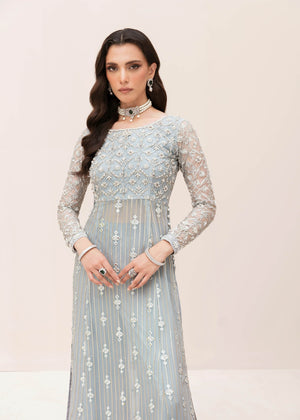 The Silver grey long shirt meticulously handcrafted and hand-embellished with sequins, crystals, and pearls . Paired with shamose silk flared pants is a mesmerizing combination of craftsmanship and artistry.