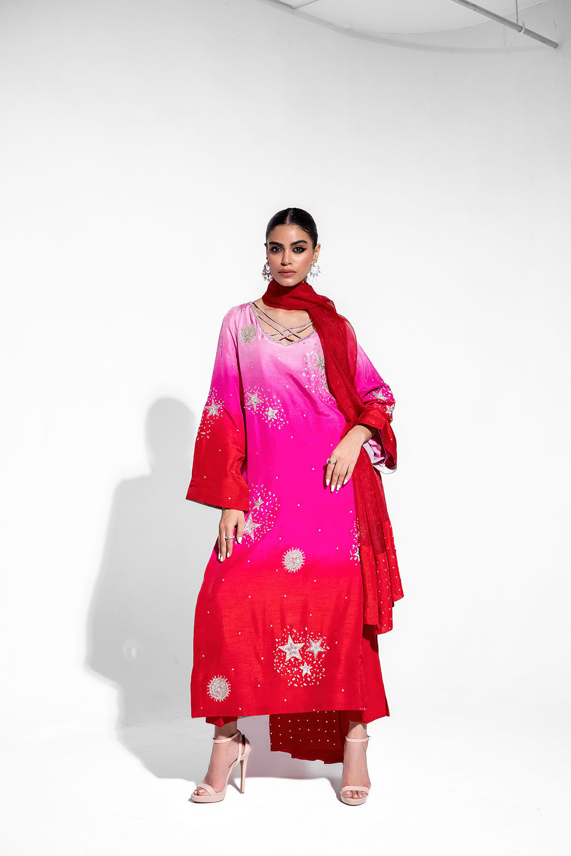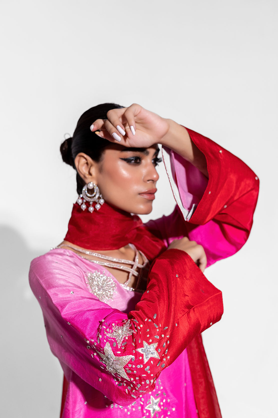 A bold burst of tonal contrasts, Sitara is for not the ordinary. A long silk kameez featuring a star burst of hand embellished motifs in dazzling silver, this ombre dress comes with red silk pants and organza dupatta with silk hemming featuring crystals all over.
