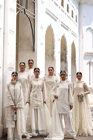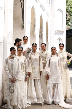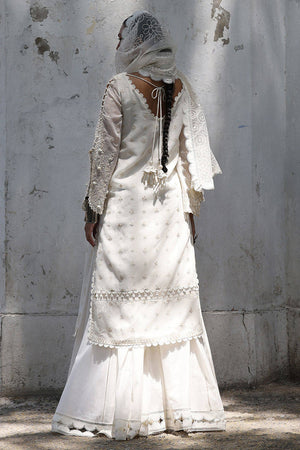 This kulla karandi cotton net shirt features a softly cut boat neckline and is richly embroidered with paisley motif -inspired schiffli embroidery that meanders across the bodice and midriff. The embroidery is further enhanced with delicate 3D floral adda work, pearls, and sequins that add light-catching intricacy without overwhelming the airy base. The scalloped hemline is matched by the similarly finished paper silk sharara, both trimmed to architectural effect. A chiffon dupatta, screen-printed with floral vines and edged with four-sided delicate trims, completes this layered yet ornate yet summery eid ensemble.