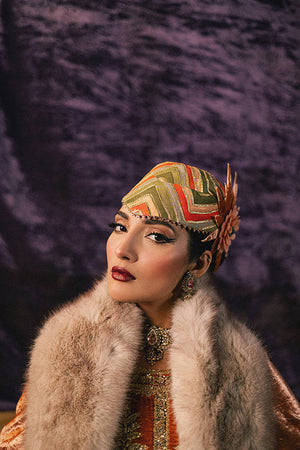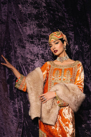 Radiant like peach sherbet, Sitara is a velvet symphony adorned with gold and green embroidery that flows gracefully across the long kameez and straight pants. The neckline and borders glisten with shimmering embellishments, featuring Mughal-inspired niche patterns, guldasta motifs, and geometric scrolls, capturing the eye with their cinematic allure. Paired with a peach-blossom-hued organza dupatta adorned with kacha tilla stripes, a jade-green chevron border, and delicate finishing trims, this ensemble evokes the nostalgic glamour of Lollywood’s golden age.