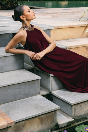 Make a chic statement on a chilly winter night in a burgundy velvet crew neck dress that drapes beautifully, creating a captivating play of shadow and light. The cut-worked details of the meticulously embroidered neckline and rich jewel tone transcends this one into a festive ensemble elevated with an asymmetrical, champagne hued waterfall skirt cut from buttery soft charmeuse.