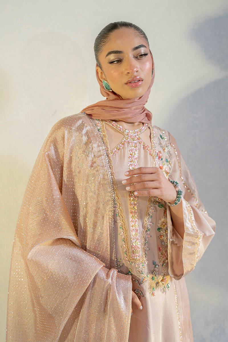 "Rosey Garden" is a breathtaking chocolate brown raw silk kalidar, adorned with delicate floral prints and intricate hand embellishments on the bodice. The stunning borders along the hem add an extra touch of elegance. The sophistication of the outfit is elevated by contrasting sea green loop button details and beautifully fitted sleeves with finely stitched cuffs. This exquisite kalidar is paired with matching trousers and a contrasting net dupatta, embellished with a delicate sequin spray that completes the look with the perfect balance of grace and glamour. Timeless and refined, this ensemble is an ideal choice for any special occasion, exuding elegance in every detail.