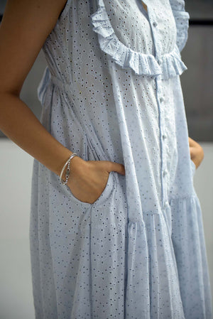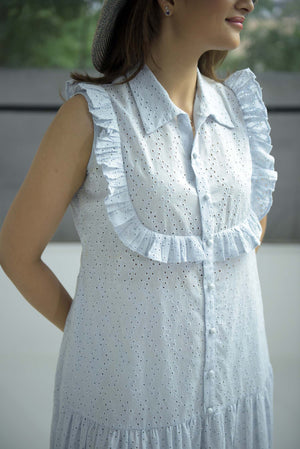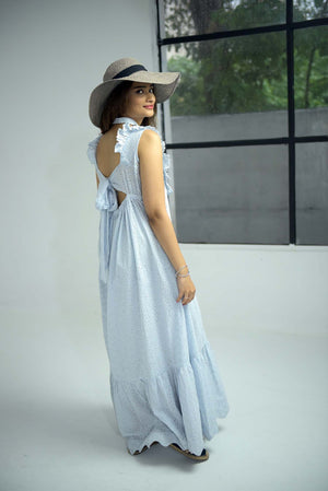 Effortlessly elegant in every way - embrace the summer season in style with our stunning pastel sky blue two-tiered dress, delicately crafted with Chikankari fabric and featuring a mesmerizing deep back lower bow.