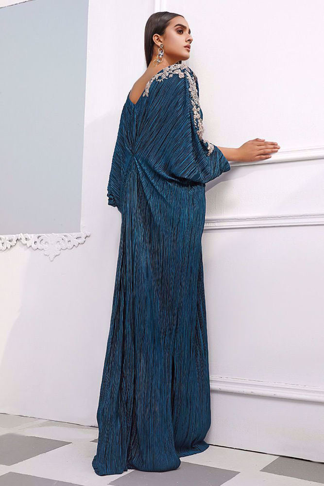 An upscale teal crush kaftan gives major fashionista goals. The 3D floral embellishments of resham, sequin, pearls and beads focus the V-neckline and waist.