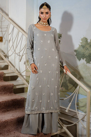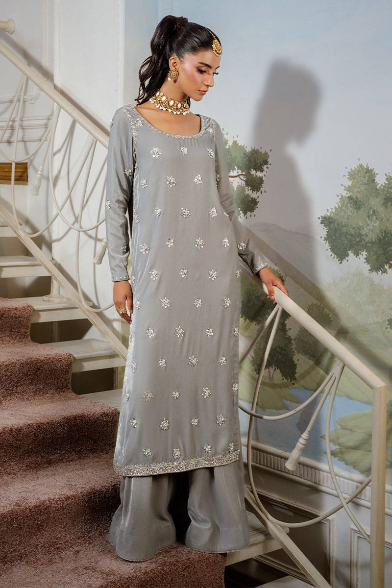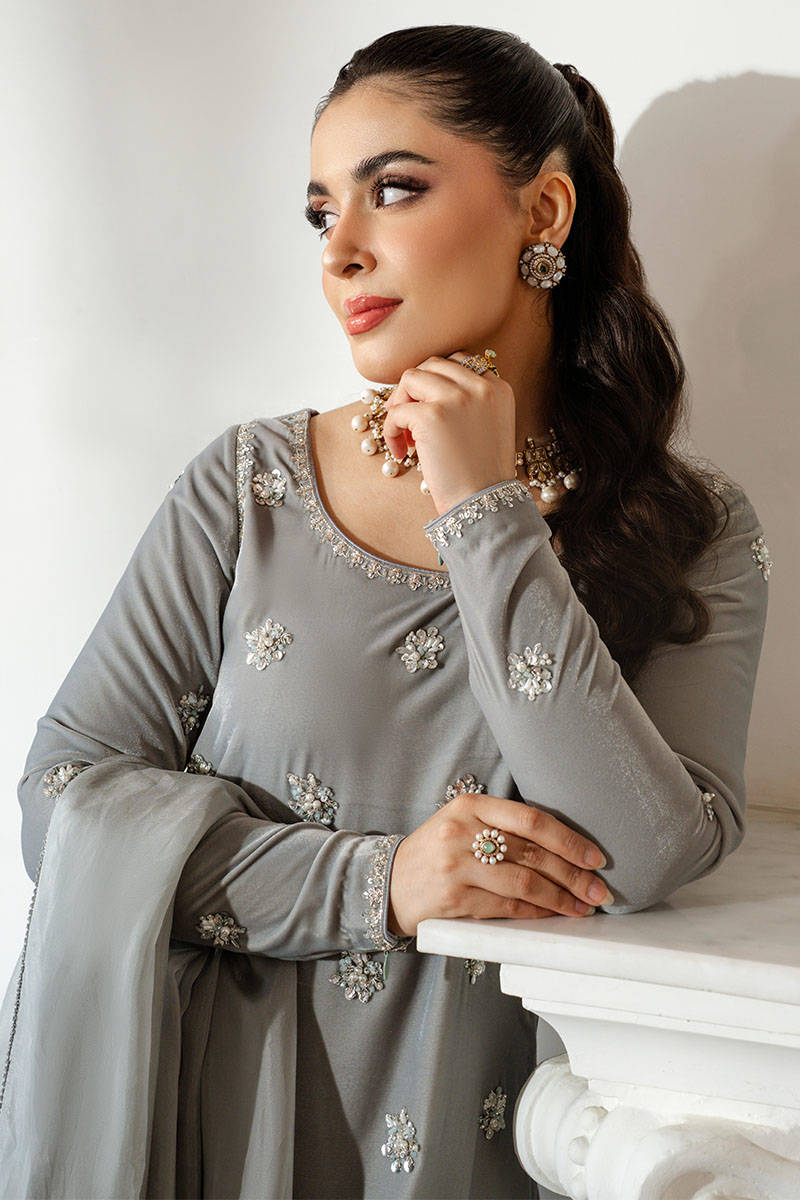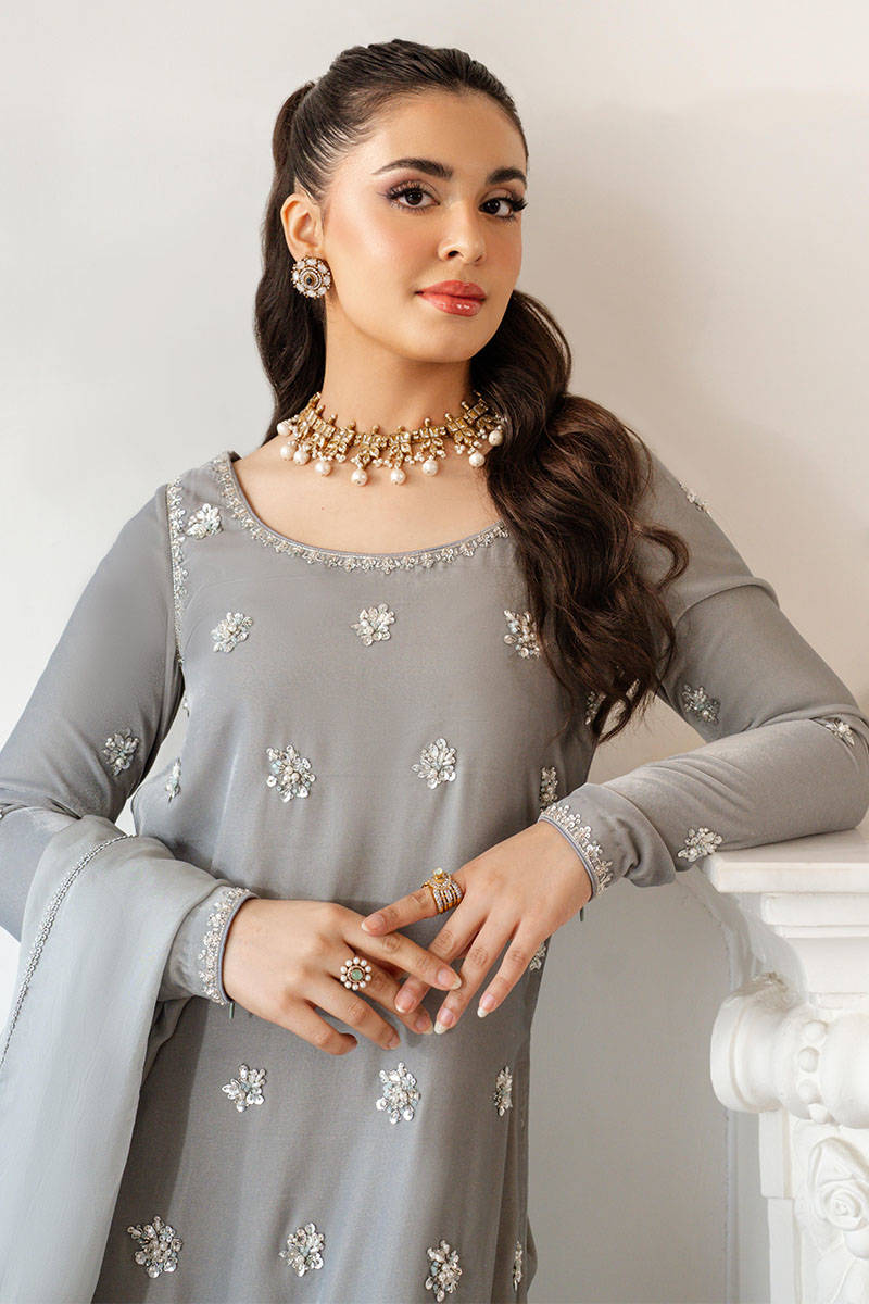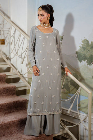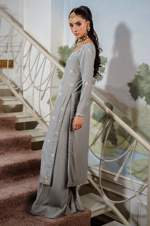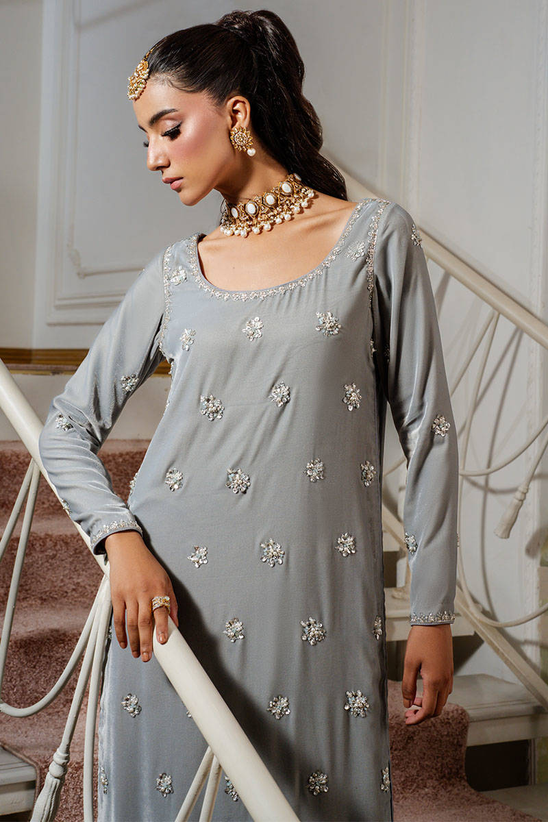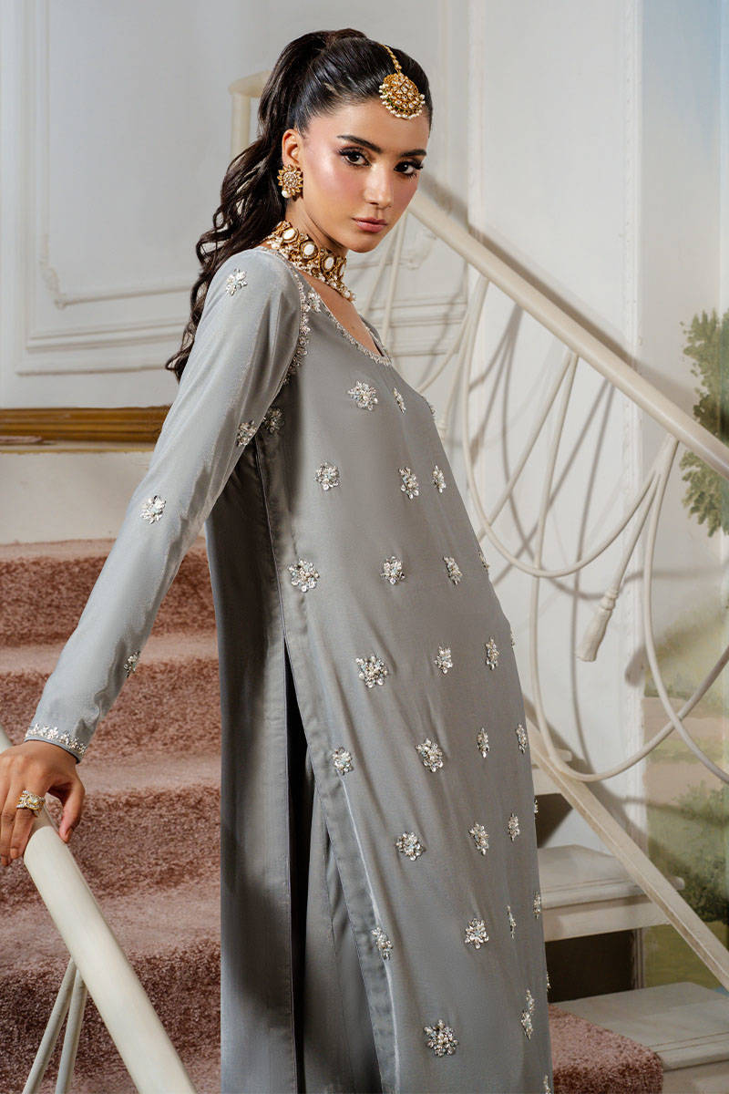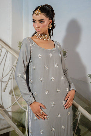 Smokey Pearl is a breathtaking long shirt adorned with intricate hand embellishments throughout, beautifully accentuated with detailed work along the hem. Paired with raw silk pants and a medium silk dupatta, this ensemble exudes graceful sophistication with a flowy, effortlessly elegant silhouette.