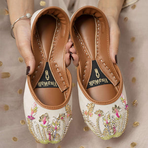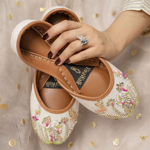 Introducing “Snow Vine” – where elegance seamlessly meets exquisite craftsmanship. These stunning khussas are intricately adorned with a mesmerizing pattern of multi-colored Katdana, dabka, naqshi, and sequins, catching the eye with every step. The upper is crafted from plush velvet, offering a luxurious feel, while the bottom is made from high-quality leather, ensuring lasting comfort. Slip into the magic of “Snow Vine” and let your feet shine, whether you’re attending a special occasion or elevating your everyday style. Don’t miss out on adding this unique piece to your collection—order today and step into a world of unmatched beauty and elegance.