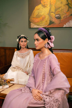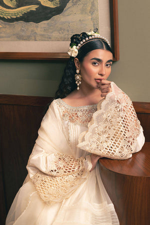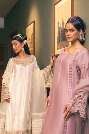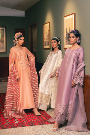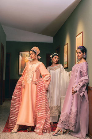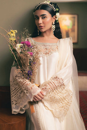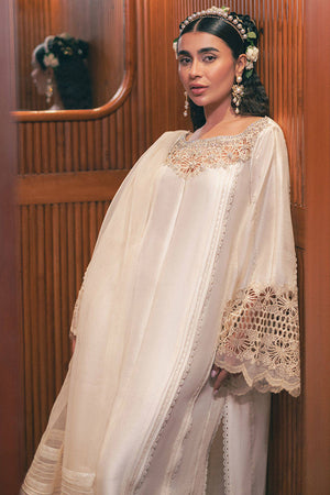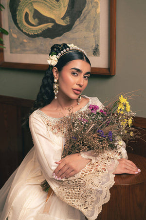Step into the delicate allure of Mohsin Naveed Ranjha's "Snowy Whisper" from the Chaye Coffee Luxury Pret Collection. This ensemble, bathed in a serene shade of pale buttercream, features a long raw silk shirt adorned with elegant pin tucks and refined trims. The laser-cut neckline is embellished with charming cosmos flower bunches, extending to the sleeves and hem. The back remains tastefully plain with pin tucks, while scalloped trims run the length of the shirt. Paired with raw silk azaar pants finished with scalloped borders, the look is completed by an organza dupatta in coordinating hues, composed of striped organza fabric and pin tucks, finished with dainty trims.