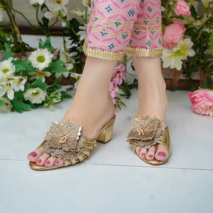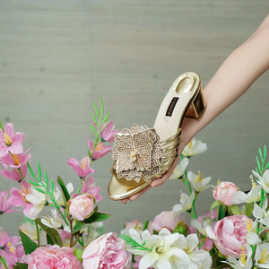 This seasons floral beauty features iridescent crystal studded petals handcrafted into a delicate rose. The mirrored gold insole adds the perfect touch of versatility to compliment any ensemble. Now available in a block heel, this sandal promises to elevate any look, without compromising on comfort.
