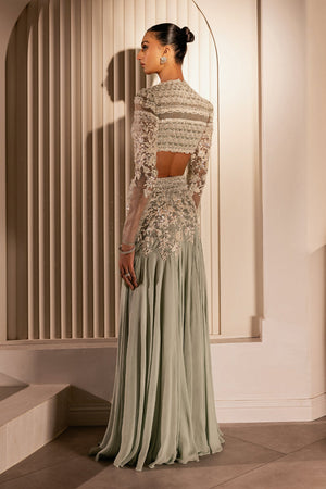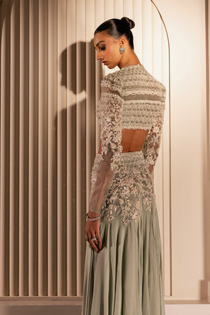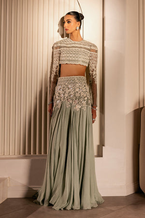 An ethereal ensemble in a delicate pistachio green hue, crafted from a luxurious blend of organza and chiffon fabrics. The outfit features a gracefully tailored organza blouse paired with a flowing skirt, elegantly draped with soft chiffon. Intricate hand-cut metallic pipes, shimmering sequins, and dainty pearls embellish the design, adding a touch of refined glamour to this timeless creation.