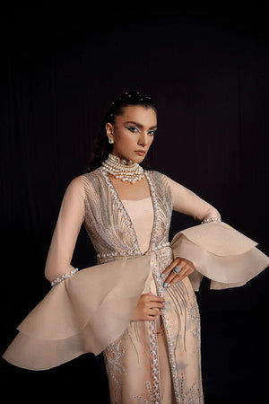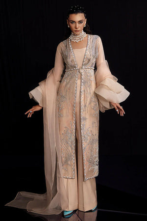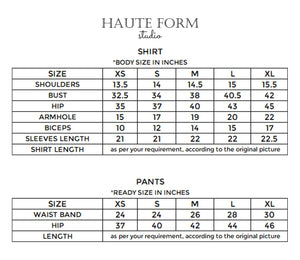 Fully hand embellished bodice cut organza jacket with exquisite hand work details stitched in materials like dabka, Swarovski stones, pearls and shiny crystals. Jacket is lined with our designers pick tie and dyed lining. Having sleeves in organza with double flared peplums attached adding a voluminous look to the outfit. It comes with plain bootcut pants in pure Thai silk fabric. Dupatta is 3 yards plain organza with four-sided fine stitch.