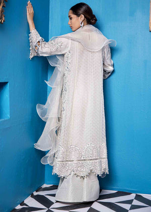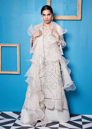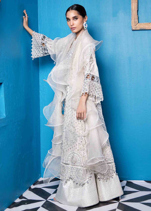 Description: Sofya is decorated with delicate pearls and mirror work. Made in a delicate pearl-white color, this extraordinary dress is a modern fusion of tradition. The lovely gharara is made of puckered fabric and adorned with a beautiful embroidered dupatta with a frill.