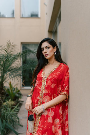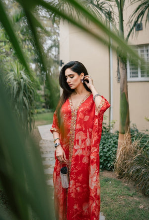 Turn up your mood with trendy silk printed airy outfit. Loose cut straight baggy shirt paired with sharara is all you want for summer evenings.