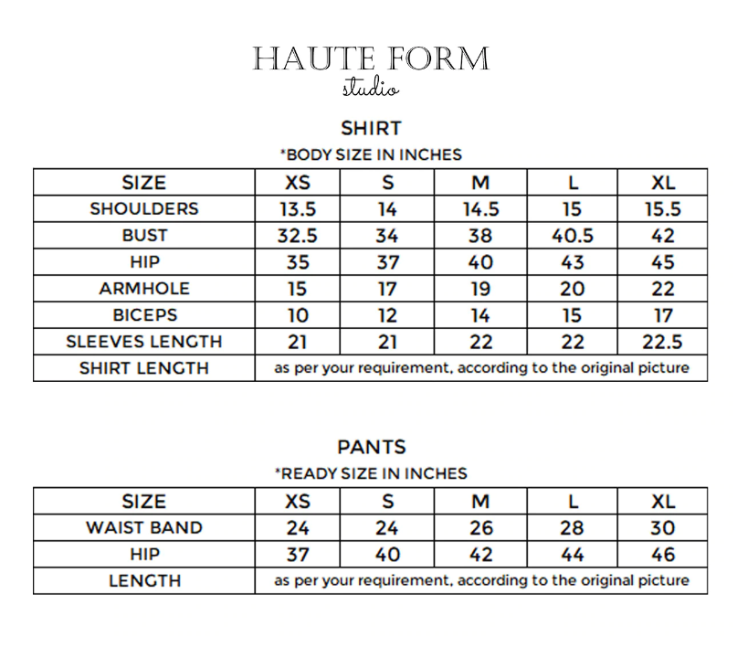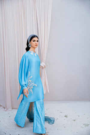Details: Sky Blue Fitted Shirt Made In Fine Tissue Silk, Finely Lined. It Is Completely And Delicately Hand Embellished Design With The Use Of Exquisite Shiny Materials. Pants Are Made In The Bootcut Style With Sequins And Shiny Stones Spray. Pants Are Well Fused Keeping The Fall And Fit In Consideration. Beautifully Cut Pleated Sleeves With Cuff Adds An Extra Value To The Design. Color/lengths/sleeves Can Be Customized. Shipping Time: 3-4 Weeks